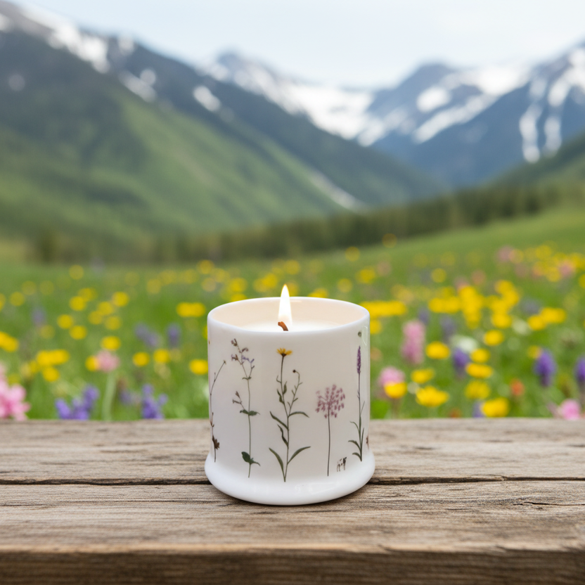 Alpine Flower luxury scented candle celebrates the glorious mountains when the snow melts. Featuring alpine cows, and alpine flowers.