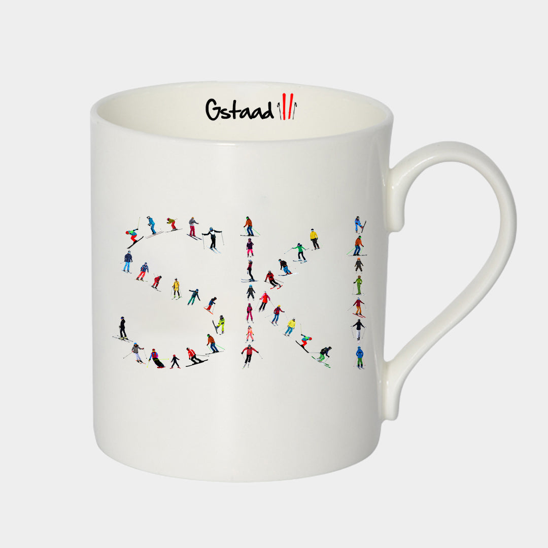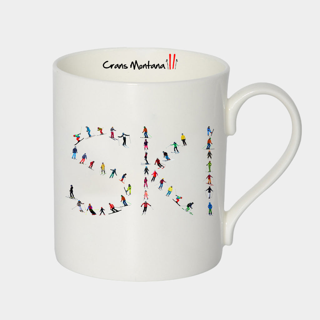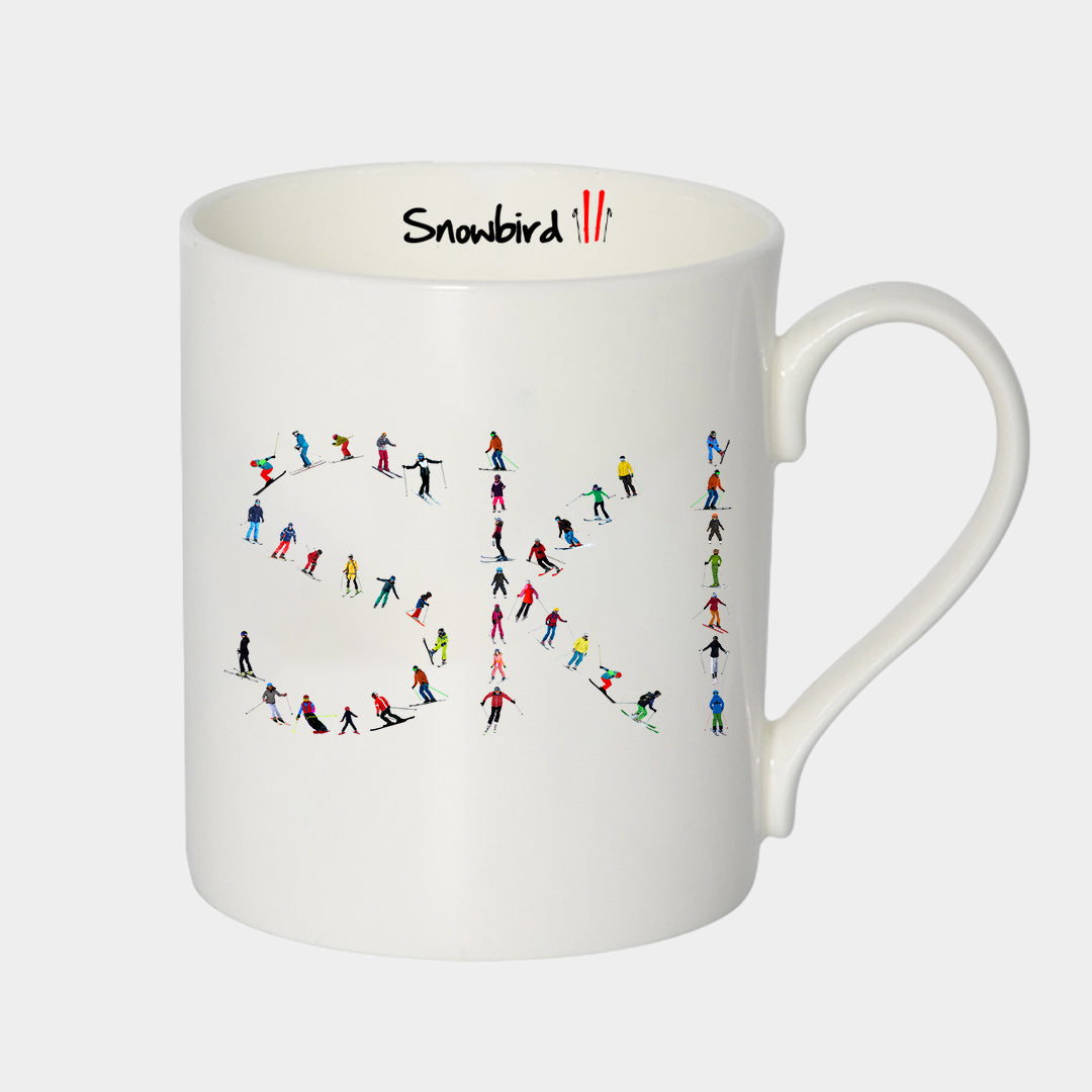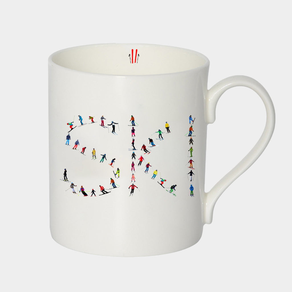 Ski Mug designed and illustrated by Natasha. Featuring miniature skiers spelling out your favourite activity SKI ! You can choose your favourite SKI resort from the dropdown list that is inserted inside the lip.