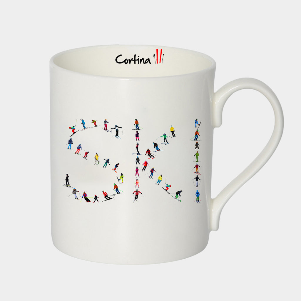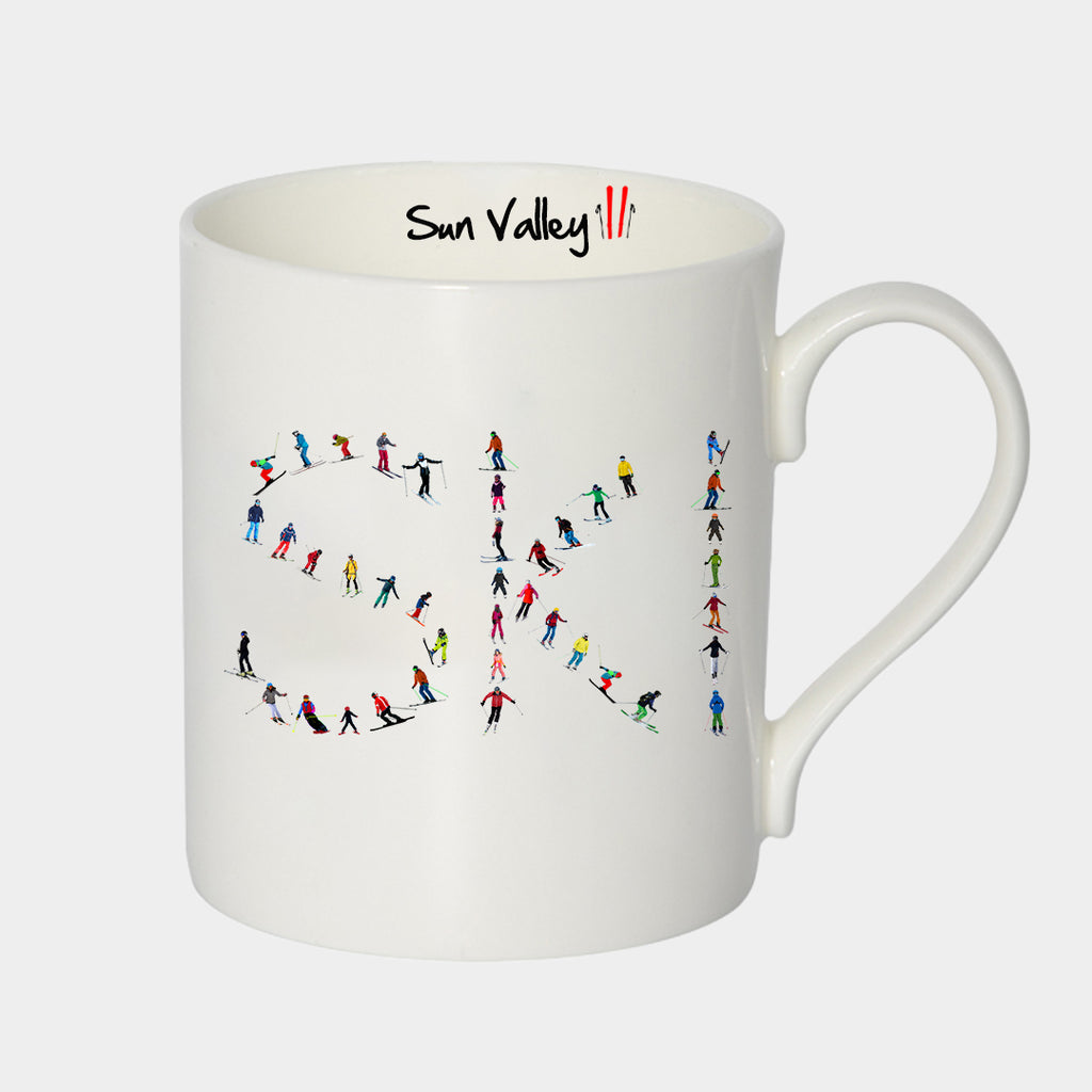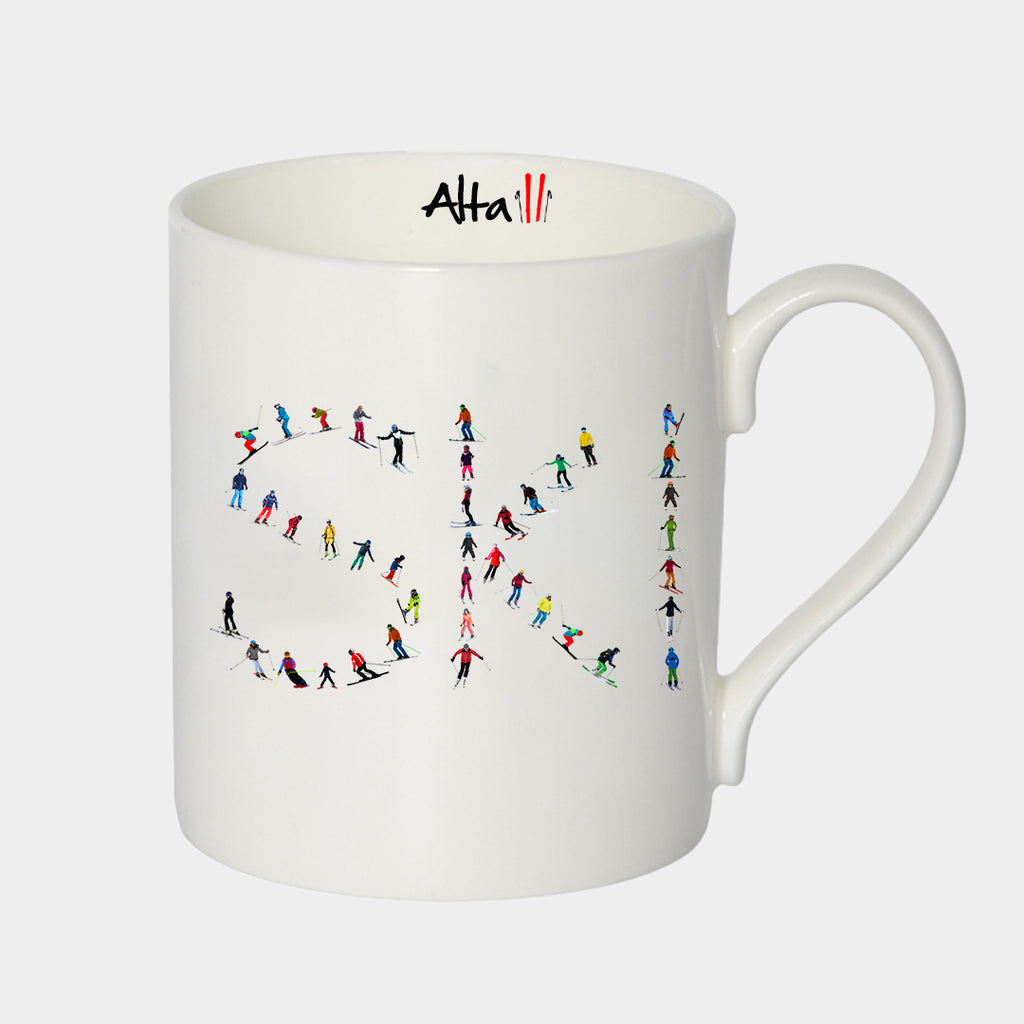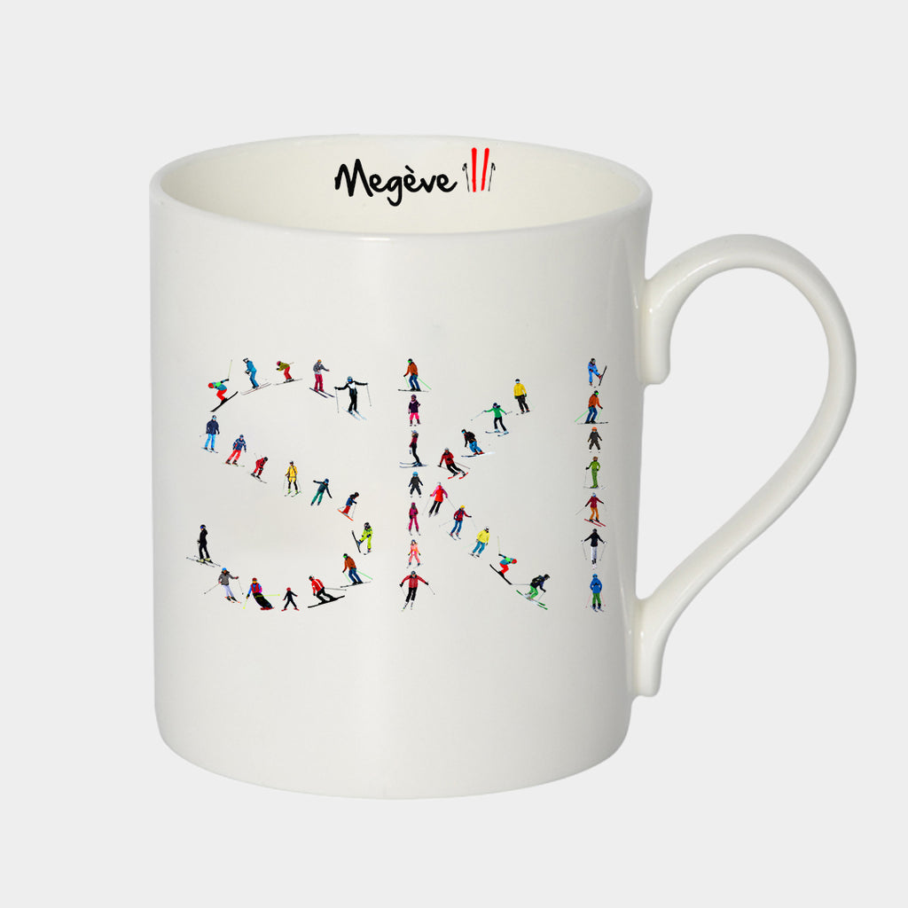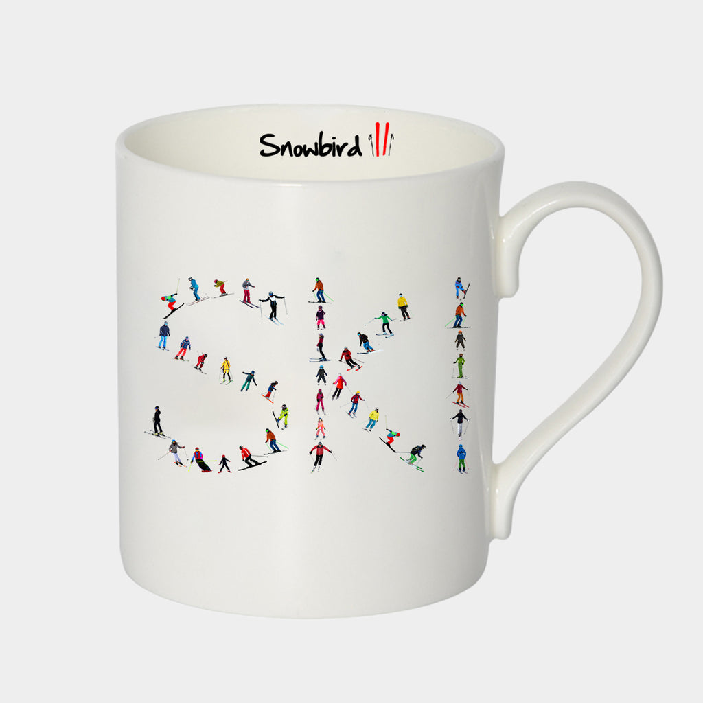 Ski Mug designed and illustrated by Natasha. Featuring miniature skiers spelling out your favourite activity SKI ! You can choose your favourite SKI resort from the dropdown list that is inserted inside the lip.