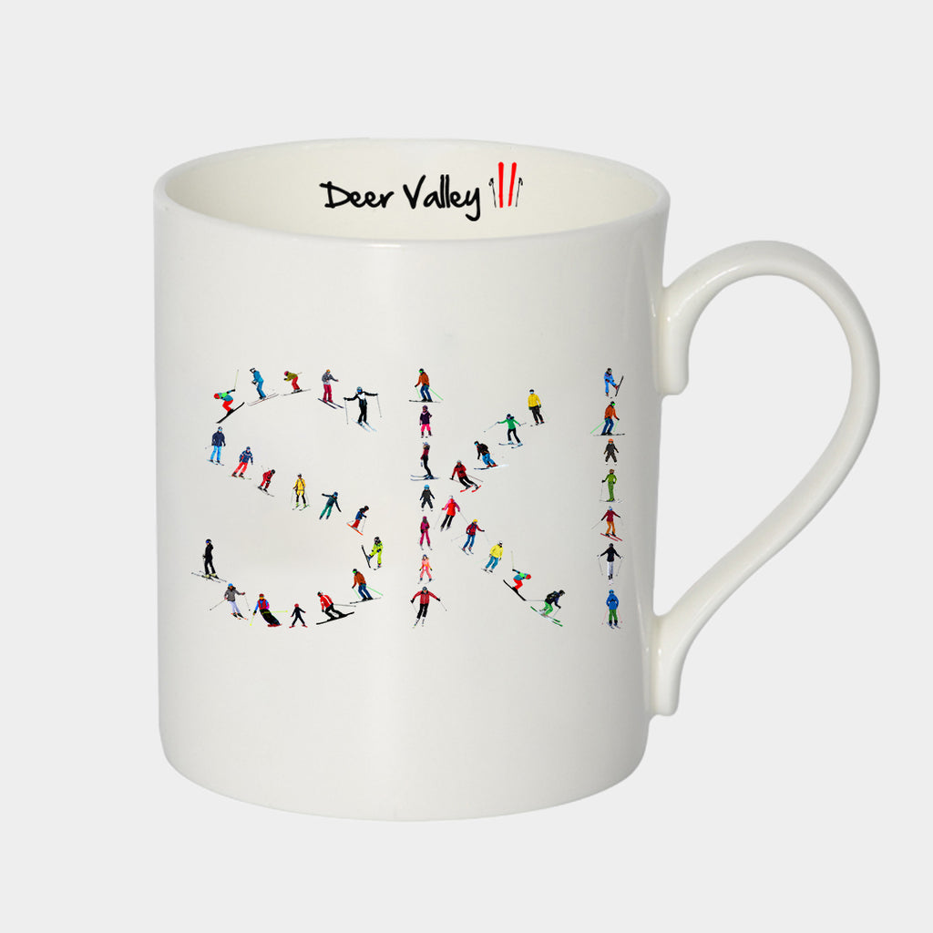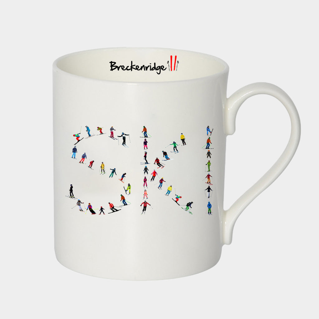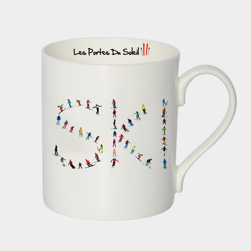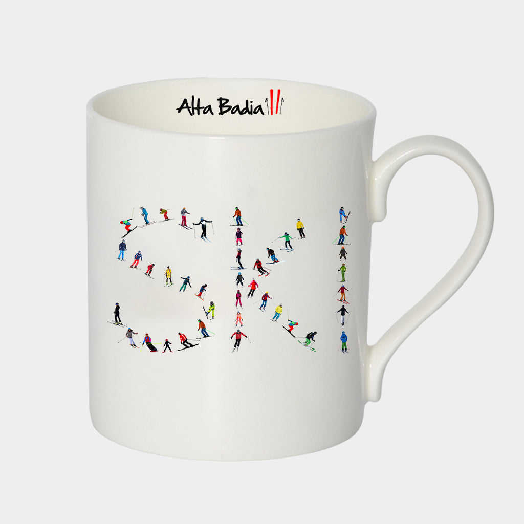 Ski Mug designed and illustrated by Natasha. Featuring miniature skiers spelling out your favourite activity SKI ! You can choose your favourite SKI resort from the dropdown list that is inserted inside the lip.